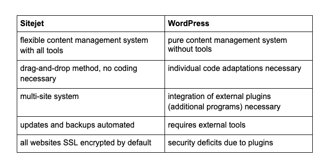 Both systems have their advantages and disadvantages, but Sitejet is closer to the flexible and uncomplicated website creation process than WordPress.