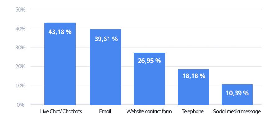 This is also supported by the following statistics, which show that Live Chat & Chatbots are the most preferred method of communication for online shopping alongside e-mail, website contact form, telephone and social media messages: